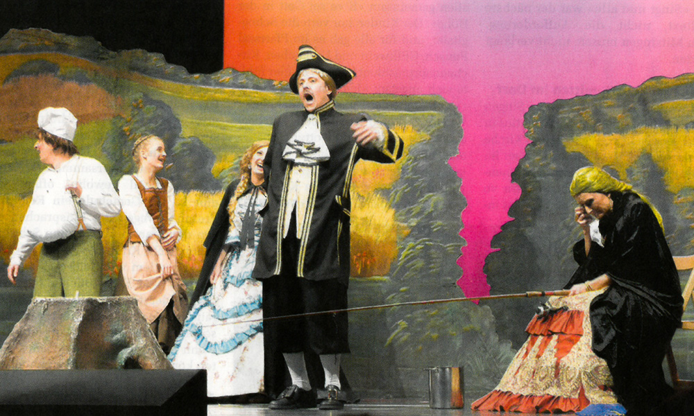 Sanfte Musik buhlt zu Beginn der Märchenaufführung um die Aufmerksamkeit des mehrheitlich jungen Publikums. Dann setzt der naschfreudige Küchenbursche Rugeliblitz (Marcel Müller) vor dem noch geschlossenen Vorhang zum Prolog an. Sein Spruch «Potz Weggliteig und Göggalibei!» wird sich ebenso zum Running Gag dieser Inszenierung entwickeln wie das «Sapperlott nomou!» des Hofmarschalls Buckelknicks (Nico Negri). Mit seinem verklemmten Benehmen und seiner mitunter krächzenden Stimme sorgt dieser regelmässig für Heiterkeit im Publikum — und mit seinem Lied im dritten der vier Bilder auch bei seinen Mitstreitern auf der Bühne.