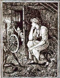 Da sass nun die arme Müllerstochter, und wusste um ihr Leben keinen Rat, denn sie verstand gar nichts davon, wie das Stroh zu Gold zu spinnen war, und ihre Angst ward immer grösser, dass sie endlich zu weinen anfing. Da ging auf einmal die Türe auf, und trat ein kleines Männchen herein und sprach: «Guten Abend, Jungfer Müllerin, warum weint sie so sehr?» «Ach», antwortete das Mädchen, «ich soll Stroh zu Gold spinnen, und verstehe das nicht.» Sprach das Männchen: «Was gibst du mir, wenn ich dirs spinne?» «Mein Halsband», sagte das Mädchen. Das Männchen nahm das Halsband, setzte sich vor das Rädchen, und schnurr, schnurr, schnurr, dreimal gezogen, war die Spule voll. Dann steckte es eine andere auf, und schnurr, schnurr, schnurr, dreimal gezogen, war auch die zweite voll: und so gings fort bis zum Morgen, da war alles Stroh versponnen, und alle Spulen waren voll Gold. Als der König kam und nachsah, da erstaunte er und freute sich, aber sein Herz wurde nur noch begieriger, und er liess die Müllerstochter in eine andere Kammer voll Stroh bringen, die noch viel grösser war, und befahl ihr das auch in einer Nacht zu spinnen, wenn ihr das Leben lieb wäre. Das Mädchen wusste sich nicht zu helfen und weinte, da ging abermals die Türe auf, und das kleine Männchen kam und sprach: «Was gibst du mir wenn ich dir das Stroh zu Gold spinne?» «Meinen Ring von dem Finger», antwortete das Mädchen. Das Männchen nahm den Ring, und fing wieder an zu schnurren mit dem Rade, und hatte bis zum Morgen alles Stroh zu glänzendem Gold gesponnen. Der König freute sich über die Massen bei dem Anblick, war aber noch immer nicht Goldes satt, sondern liess die Müllerstochter in eine noch grössere Kammer voll Stroh bringen und sprach: «Die musst du noch in dieser Nacht verspinnen; wenn dir das gelingt, sollst du meine Gemahlin werden». «Denn», dachte er, «eine reichere Frau kannst du auf der Welt nicht haben.» Als das Mädchen allein war, kam das Männlein zum drittenmal wieder, und sprach: «Was gibst du mir, wenn ich dir noch diesmal das Stroh spinne?» «Ich habe nichts mehr, das ich geben könnte», antwortete das Mädchen. «So versprich mir, wann du Königin wirst, dein erstes Kind.» «Wer weiss wie das noch geht», dachte die Müllerstochter, und wusste sich auch in der Not nicht anders zu helfen, und versprach dem Männchen was es verlangte; dafür spann das Männchen noch einmal das Stroh zu Gold. Und als am Morgen der König kam, und alles fand wie er gewünscht hatte, so hielt er Hochzeit mit ihr, und die schöne Müllerstochter ward eine Königin.