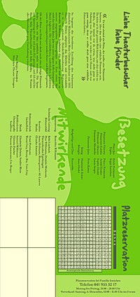 Im Gegensatz zu den vergangenen Programmheften wollte man in dieser Saison einmal einen etwas anderen Weg wählen. Anstelle des abgenutzten, zweifarbigen Faltblättchens im A5-Format wollte man dieses Mal einen Schritt weitergehen und ein etwas grösseres Format im Vierfarbendruck verwenden. Das ermöglichte natürlich einige gestalterische Freiheiten, die bis anhin nicht gegeben waren. Nach mühsamer Schneide- und Klebearbeit wurde schliesslich der erste Prototyp fertiggestellt und dem Vorstand zur Beurteilung übergeben. Offensichtlich war es die Prinzessin, die in diesem ersten Entwurf eher negativ bewertet wurde. Also musste eine neue Königstochter her, die besser zum klassischen Märchenstil unseres Theatervereins passte.
