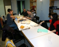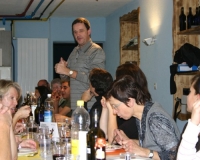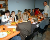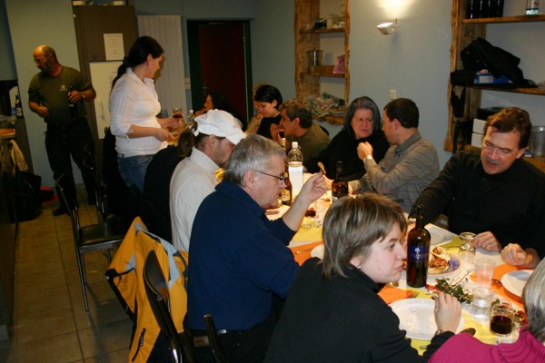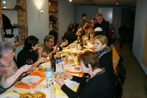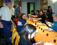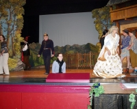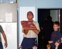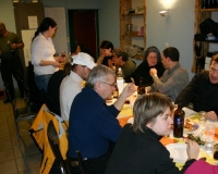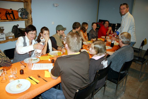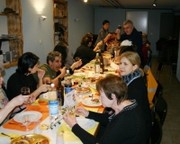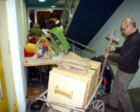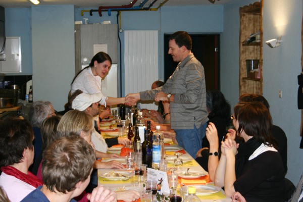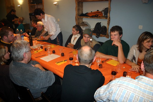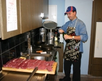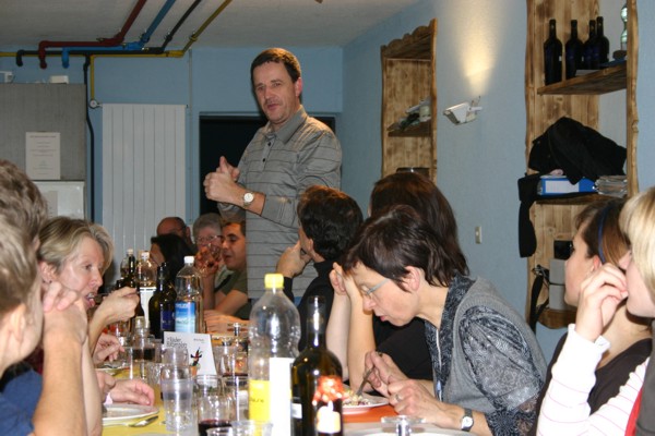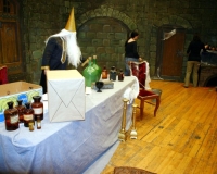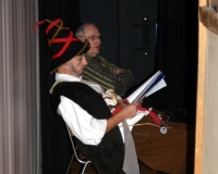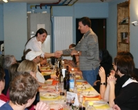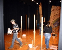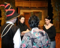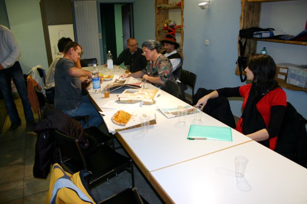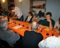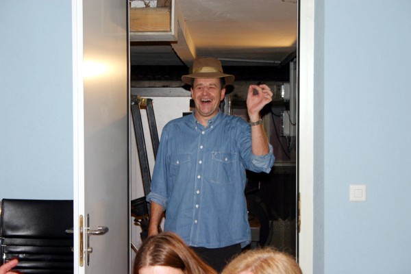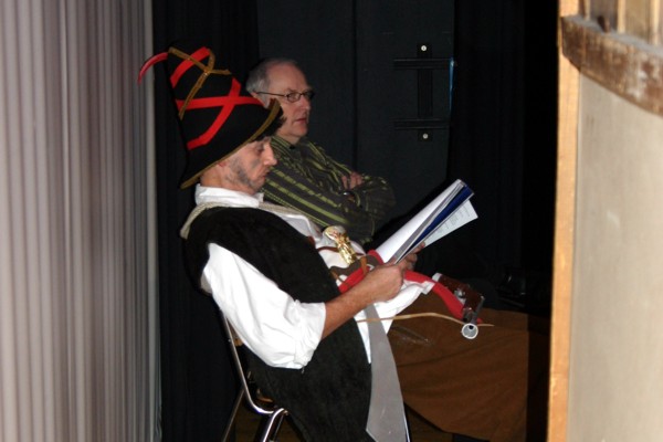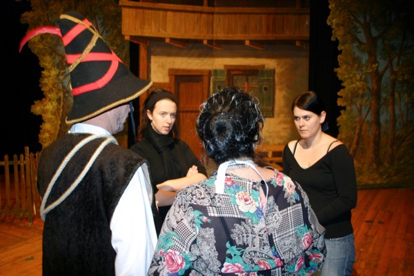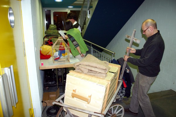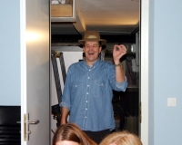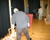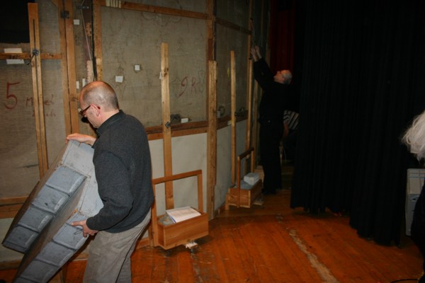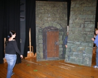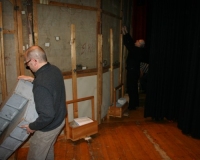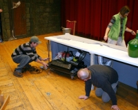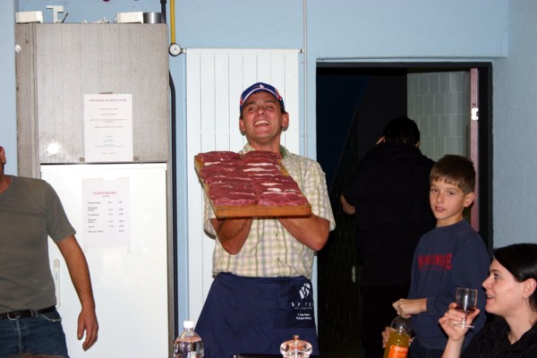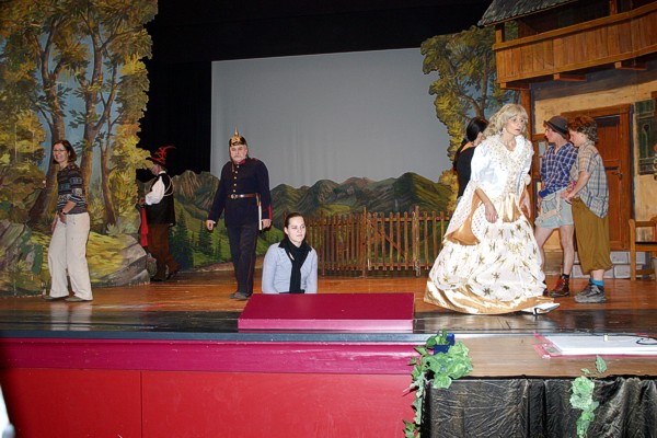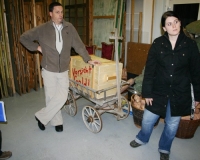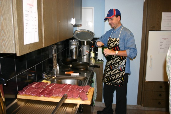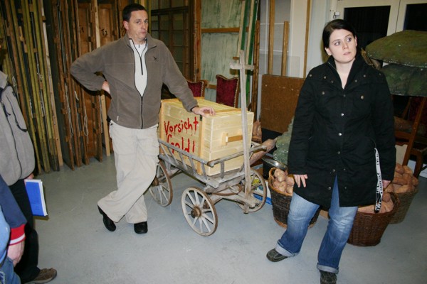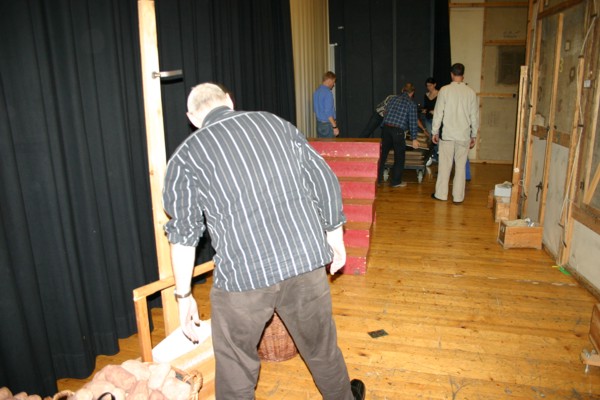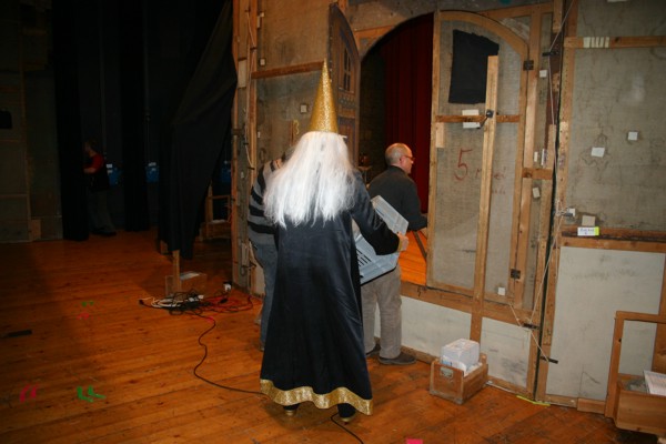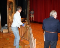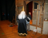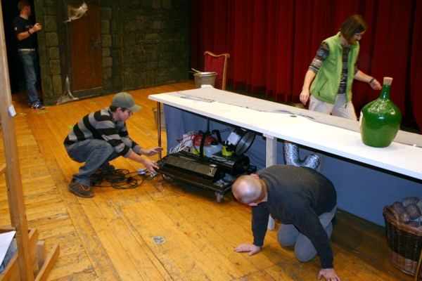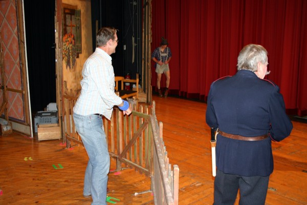 Viele Requisiten warten auf ihren Einsatz, doch der Platz ist beschränkt.In Zwackelmann's Schloss gibt es viele Spezialeffekte. Yves und Werni Frey (rechts) richten dazu die Nebelmaschine ein.Viele Fläschchen stehen auf Zwackelmann's Küchentisch.Kurze Lagebesprechung hinter dem Vorhang.Hotzenplotz's Waldversteck wird abgeräumt.Kurzes Verschnaufen auf der Probenbühne, bevor die nächste Szene dran kommt.Im Hirschen gibt's immer eine kleine Stärkung.Wenn Robi Lisebach (links) und Seppi Ineichen (3.v.l.) die Kochschürzen anziehen, gibt's etwas auf den Teller!Gespannt wartet man nach der Aufführung auf das wohlverdiente Znacht.«So muss ein richtiges Entrecôte aussehen!»Seppi Ineichen an der Bratpfanne.«Und dazu gibt's ‹e tätschchaute Wisse›!»Blick von der Bühne Richtung Vorhang.Räuber Hotzenplotz (Seppi Ineichen) bereitet sich auf seinen Auftritt vor.Sophie Hodel (rechts) und Seppi Ineichen im Kulissenraum.Die riesigen Schlosskulissen werden aufgestellt.Hinter den Kulissen warten bereits die nächsten Requisiten.Blick hinter die Kulissen: Werni Frey (links) und Pius Willimann beim Aufbau.Durch dieses grosse Tor wird Zwackelmann seinen Auftritt haben.Ein weiteres Nachtessen in gemütlicher Runde.Auf die abgeschlossene Aufführung wird noch einmal gebührend angestossen.Jung und alt diskutiert über die eben beendete Aufführung, während man hungrig auf das Essen wartet.Seppi Ineichen ist stolz auf die grosse Märchentheater-Familie......und gratuliert Regisseurin Sophie Hodel für ihr Engagement.