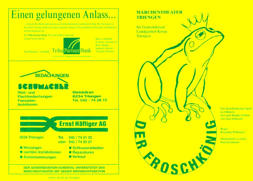 Das Märchen «Der Froschkönig» aus der Feder von Jörg Schneider beinhaltet vorwiegend lustige, komische, aber auch spannende Szenen. Wir geben uns grosse Mühe, mit einer ausgewählten Rollenbesetzung, einem bunten Bühnenbild, aufwändigen Kostümen und gekonnter Maske ein «richtiges» Märchen zu inszenieren.