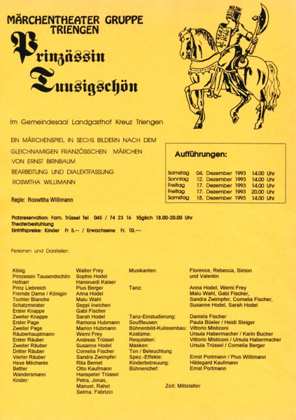 Ein Märchenspiel in sechs Bildern nach dem gleichnamigen französischen Märchen von Ernst Birnbaum. Bearbeitung und Dialektfassung: Roswitha Willimann.